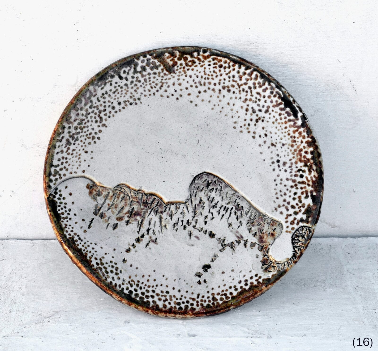 Luis Mandiola’s ceramic work consistently positions the circular plate as both a functional form and an artistic surface, a format that draws from the entire history of decorated ceramics, from pre-Columbian times to contemporary studio practice. The mottled brown rim and the fine crackle of the glaze are material evidence of the high-temperature firing process: the kiln, acting as a collaborator, adds its own marks to the final image.